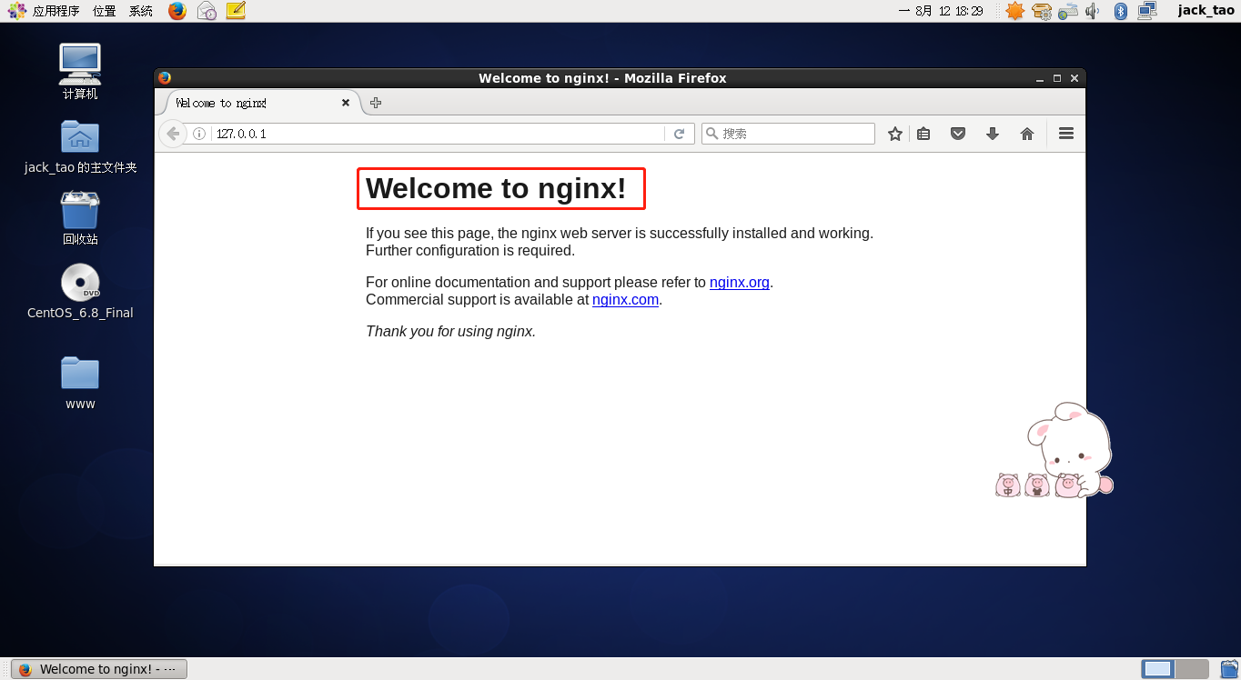 - 回到centos系统,在浏览器中输入http://127.0.0.1:80,成功访问nginx服务