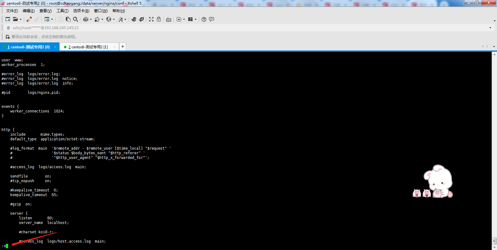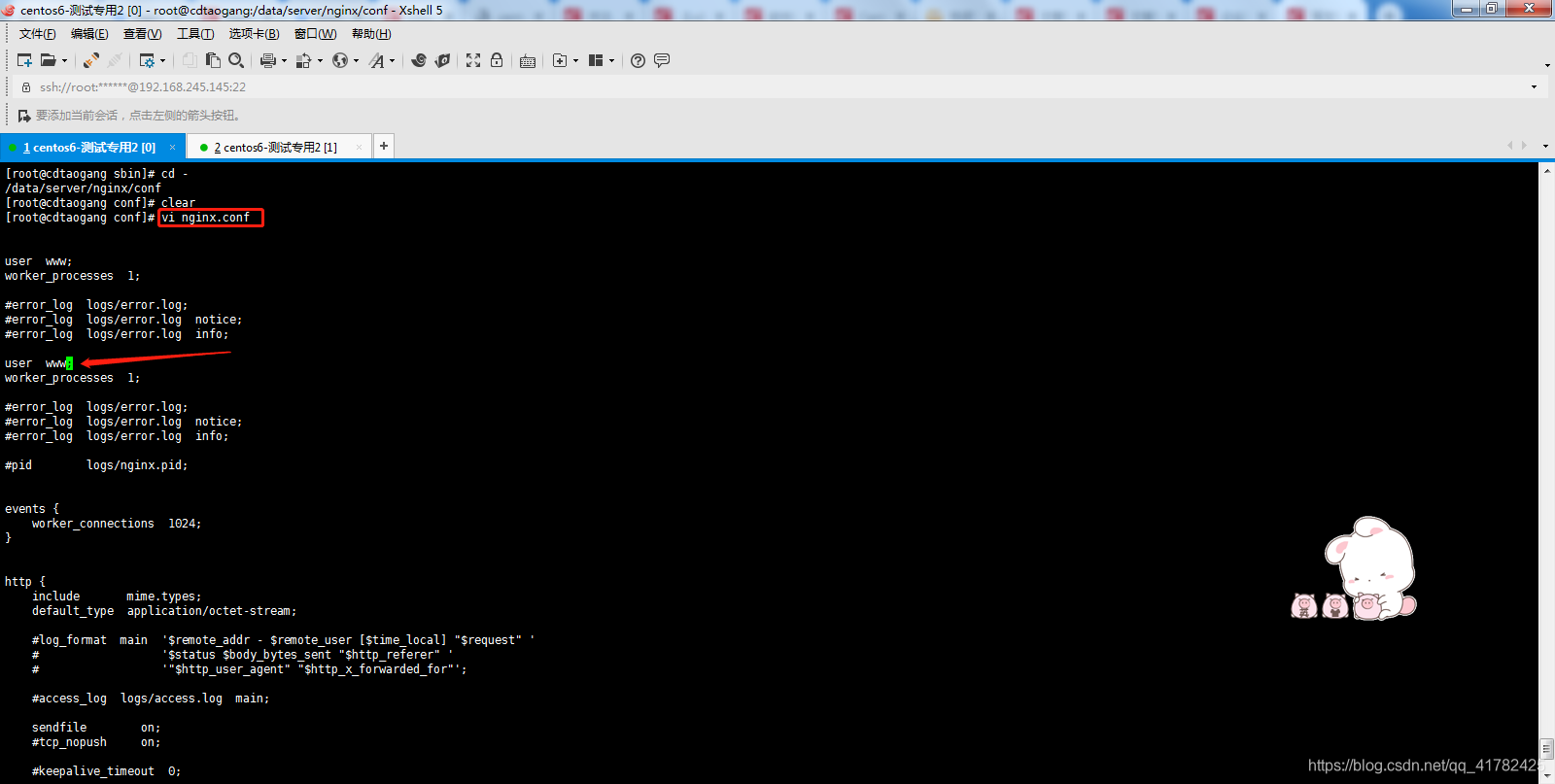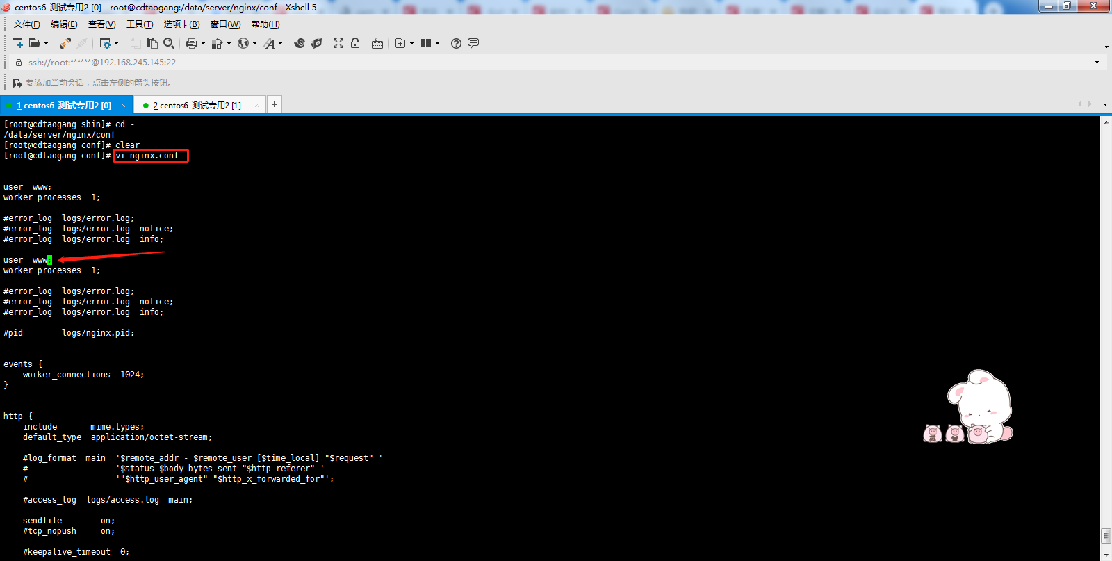- 进入ngin/conf目录,使用vi命令编辑nginx.conf文件,将user后面的nobody更改为www