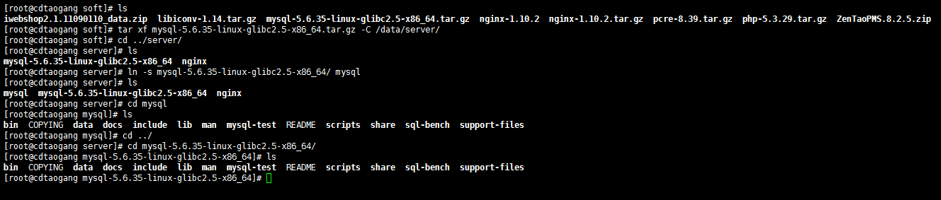- 进入soft目录,解压mysql压缩包到server目录下,解压成功后,进入server目录并查看该目录下的文件