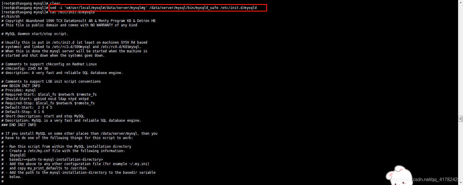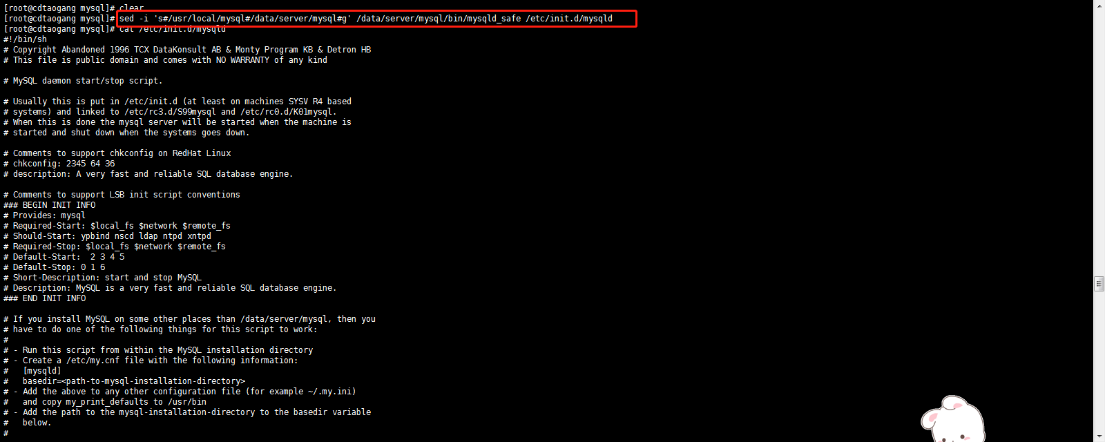 - 通过sed命令(例:sed -i '#原文件内容'#'替换后的内容#g' file)将/etc/init.d/mysqld文件以及/data/server/mysql/bin/mysqld_safe文件的路径修改为data/server/mysql