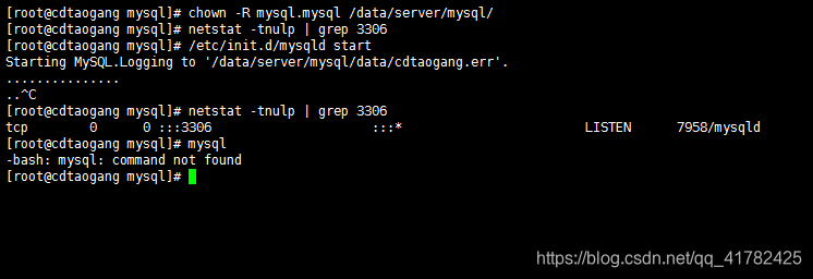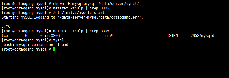 - 之前设置了mysql数据库的启动用户mysql,所以现在需要设置该用户的权限,紧接着查看3306端口有没有在使用,最后启动mysql服务,输入mysql时提示not found