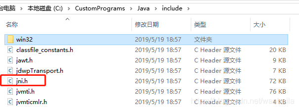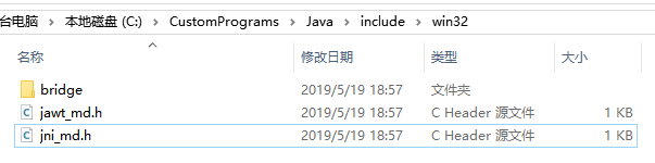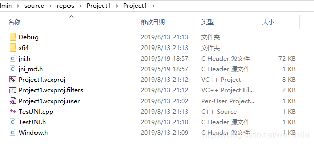 第五步,将生成的Window.h 以及 %JAVA_HOME% 目录下的include文件夹中的Jni.h 和 win32下的jni_md.h 共三个头文件复制到刚才新建的DLL项目源文件目录下