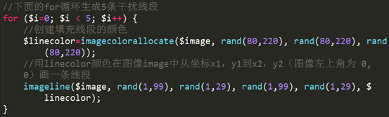 4、生成干扰线段代码如下:函数-> imagecolorallocate(); Imageline();