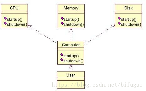 外观模式是为了解决类与类之家的依赖关系的,像spring一样,可以将类和类之间的关系配置到配置文件中,而外观模式就是将他们的关系放在一个Facade类中,降低了类类之间的耦合度,该模式中没有涉及到接口,看下类图:(我们以一个计算机的启动过程为例)