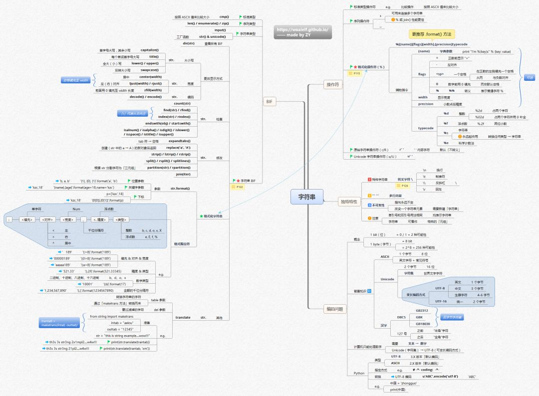 字符串是个比较庞大而精细的部分,接着上图的BIF可分为标准类型、序列类型、字符串类型,字符串可分为五种操作符类型,此图还整理了序列的独特特性以及编码问题,可以说很详细了。