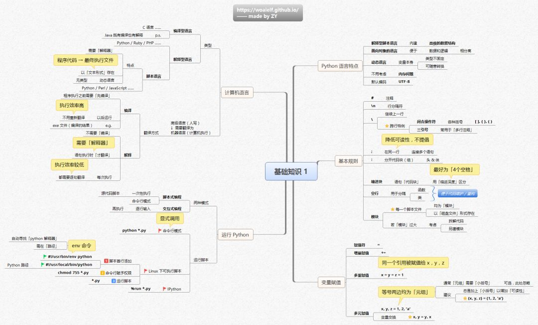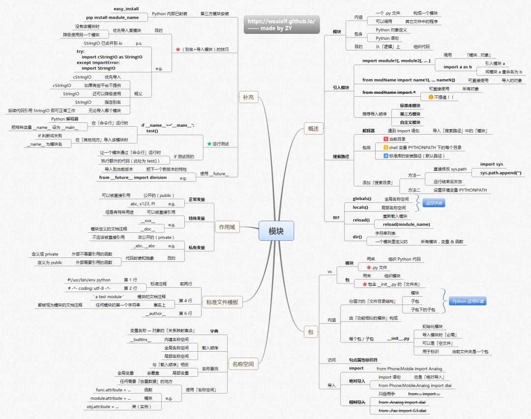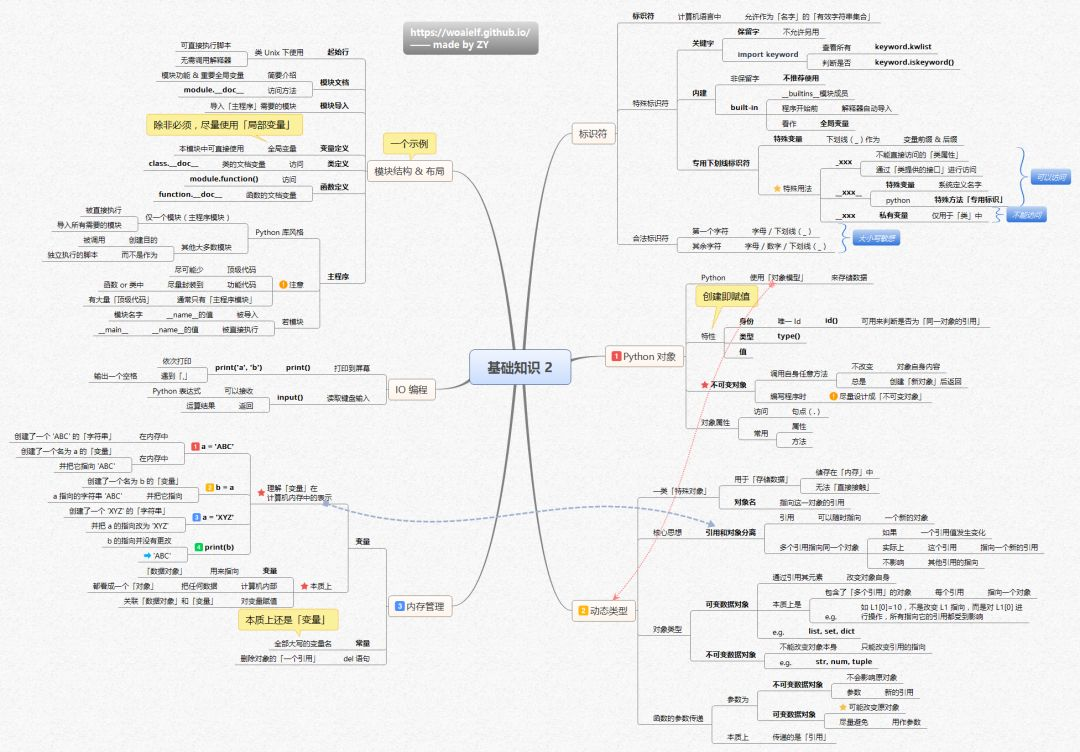 基础知识2:模块结构、布局、IO编程流程、标识符、Python对象、内存管理、动态类型六大模块,两张基础知识导图可以帮助你区域化了解Python的组成部分及基本操作。