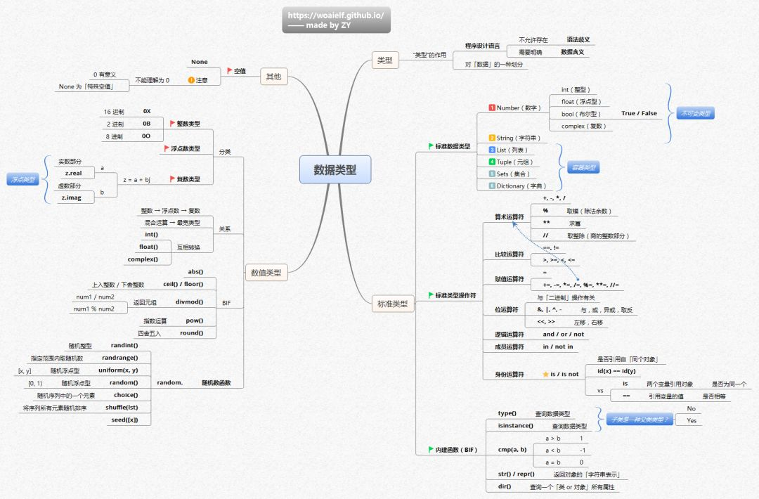 学习Python少不了对数据的了解,这张图整理了数据类型的分类、作用、空值、标准数据、if语句等等模块。