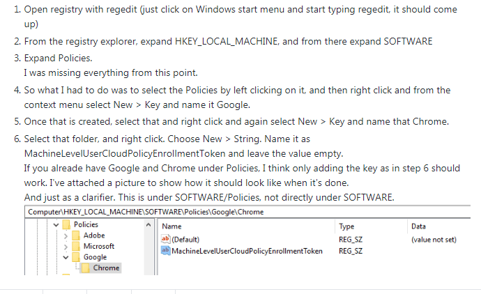- As per [14452:3972:0531/170507.354:ERROR:install_util.cc(597)] Unable to read registry value HKLM\SOFTWARE\Policies\Google\Chrome\MachineLevelUserCloudPolicyEnrollmentToken for writing result=2 it wasn't an error that will block Chrome usage but still this had been fixed through the commit Logging tweaks for enrollment token retrieval