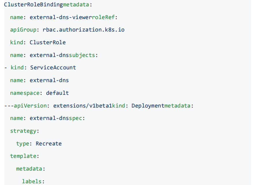 8、由于在基于Rancher的Kubernetes集群上默认启用了RBAC,因此可以从下面的脚本创建名为externaldns.yaml的yaml文件,或者使用此repo中的externaldns-template.yaml文件。