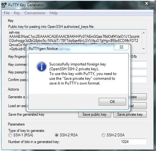 e. Puttygen shows a notice saying that it Successfully imported foreign key. Click OK.