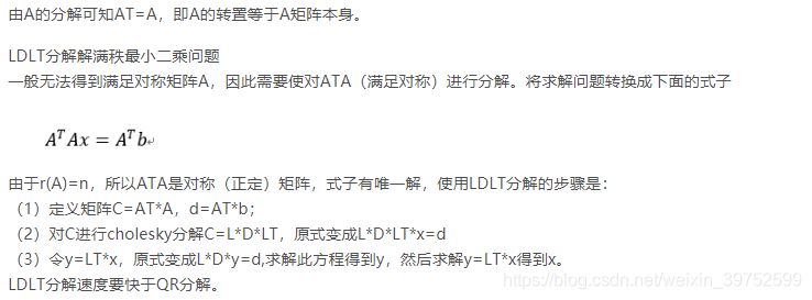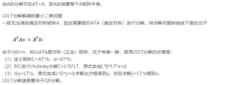 Cholesky分解是LDLT分解的一种特殊形式,也就是其中的D是单位矩阵。正定对称矩阵 A可以分解成一个下三角矩阵L和这 个下三角矩阵L的转置LT相乘的形式。如下式