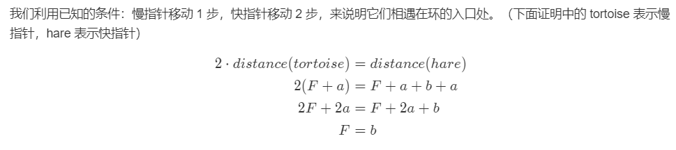 这里我们初始化两个指针 - 快指针和慢指针。我们每次移动慢指针一步、快指针两步,直到快指针无法继续往前移动。如果在某次移动后,快慢指针指向了同一个节点,我们就返回它。否则,我们继续,直到 while 循环终止且没有返回任何节点,这种情况说明没有成环,我们返回 null 。