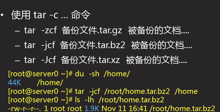 ]# tar -jcf /opt/file.tar.bz2 /etc/passwd /etc/shadow /home/
