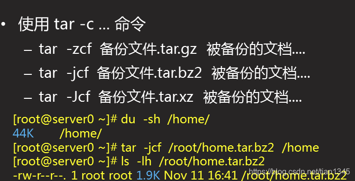 – 创建一个名为 /root/backup.tar.bz2 的归档文件