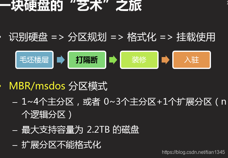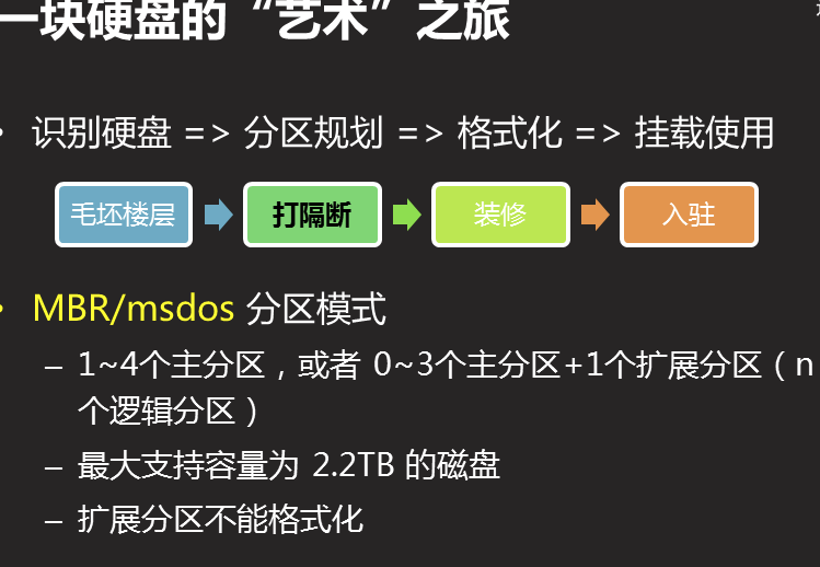 • 识别硬盘 => 分区规划 => 格式化 => 挂载使用