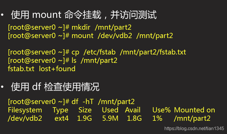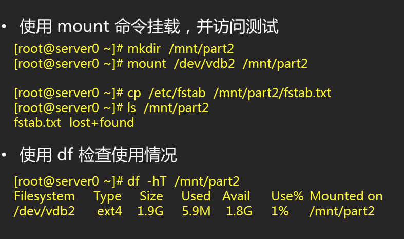 [root@server0 ~]# mount /dev/vdb1 /mypart1 #进行挂载