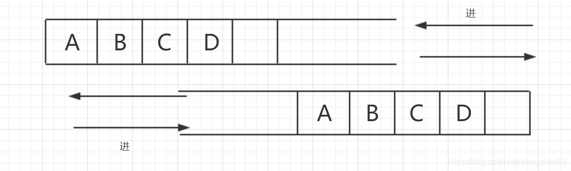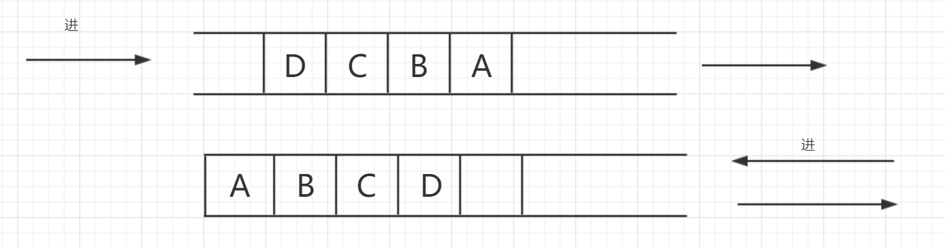 在队列中对一个出来的是A,在栈中第一个出来的是D。而一个栈是先进先出ABCD,那么用另外一个栈做存储。A栈存着ABCD,弹出存到B栈中,就得到: