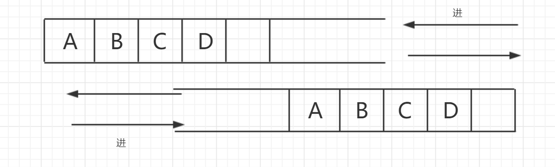 思路:栈是先进先出,队列是先进后出。那么两个栈需要实现的就是先进后出。比如输入ABCD,按顺序放在一个栈里面就是ABCD。见下图