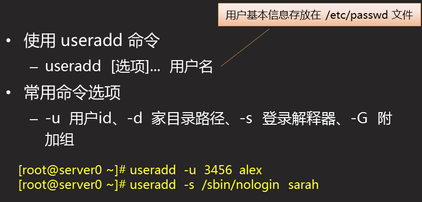– -u 用户id、-d 家目录路径、-s 登录解释器、-G 附加组