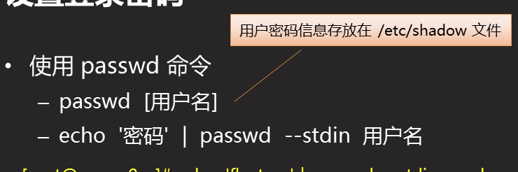 [root@A ~]# echo '密码' | passwd --stdin 用户名