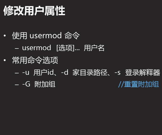 – -u 用户id、-d 家目录路径、-s 登录解释器、-G 附加组(重置附加组)