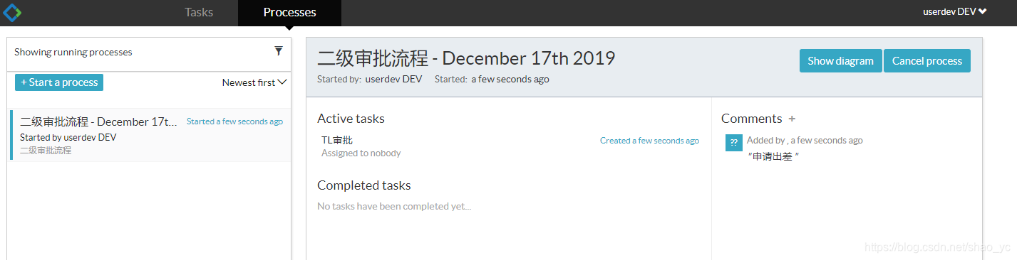 然后退出当前tl用户,用hr登录,进行同样的操作,最后流程结束。而在HR审批完成后,Process中是无法查看到的,此时的权限是无法看到的,需要用到另一个模块activiti-admin。