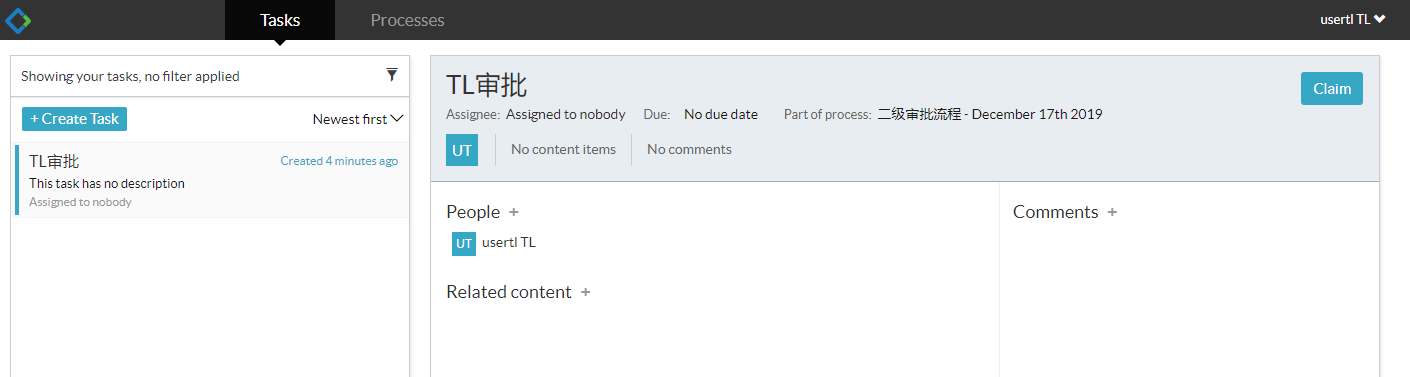 然后退出当前登录,使用TL登录,选择审批模块之后可以看到有一个待办任务,点击Cliam即为获取待办任务,然后可以写备注,再点击Complete完成。