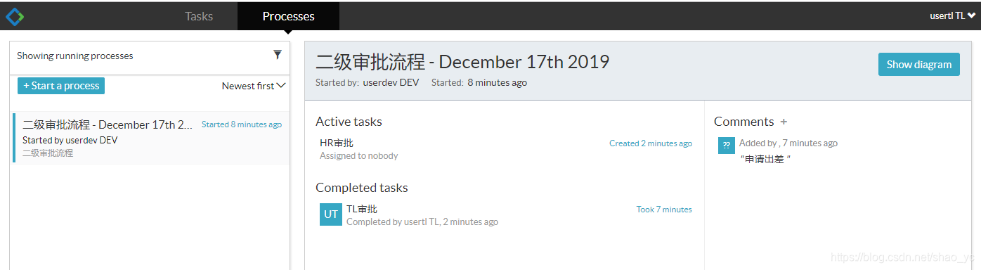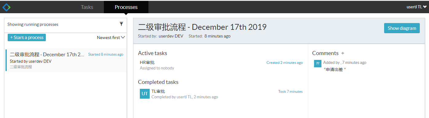 然后点击流程,用Show diagram查看,可以看到节点进行到了HR审批。