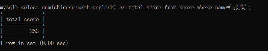 select sum(chinese+math+english) as total_score from score where name='张欣';