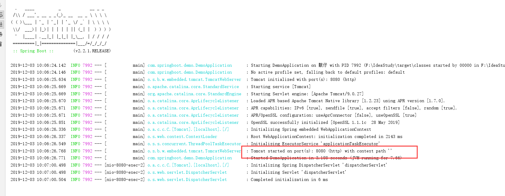 从控制台可以看到Springboot有内嵌式Tomcat。