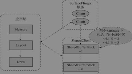 既然是两个不同进程,就需要一个跨进程的通信机制来实现数据传输,在Android的显示系统,使用了Android的匿名共享内存:sharedClient,每一个应用和surfaceFlinger之间都会创建一个sharedClient,如图1.3,在每一个sharedClient中,最多可以创建31个sharedBufferStack,每个surface都对应一个sharedBufferStack,也就是一个window。