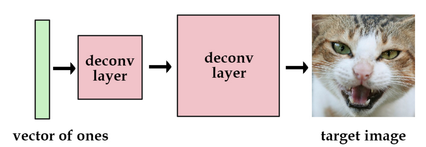 假如我们有一个带有解卷积层的网络,我们设置输入为值全为1的向量,输出为一张图像。然后,我们可以训练这个网络去减小重构图像和原始图像的平均平方误差。那么训练完后,这个图像的信息就被保留在了网络的参数中。