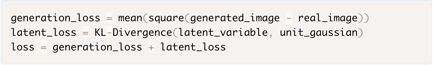 我们可以让网络自己去决定这种权衡。对于我们的损失函数,我们可以把这两方面进行加和。一方面,是图片的重构误差,我们可以用平均平方误差来度量,另一方面。我们可以用KL散度(KL散度介绍)来度量我们潜在变量的分布和单位高斯分布的差异。