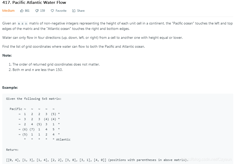题目大意,找出能同时流向太平洋和印度洋的区域,太平洋区域为左边和上边,印度洋区域为右边和下边。只有当前区域高度大于或等于相邻区域高度才能流向该区域