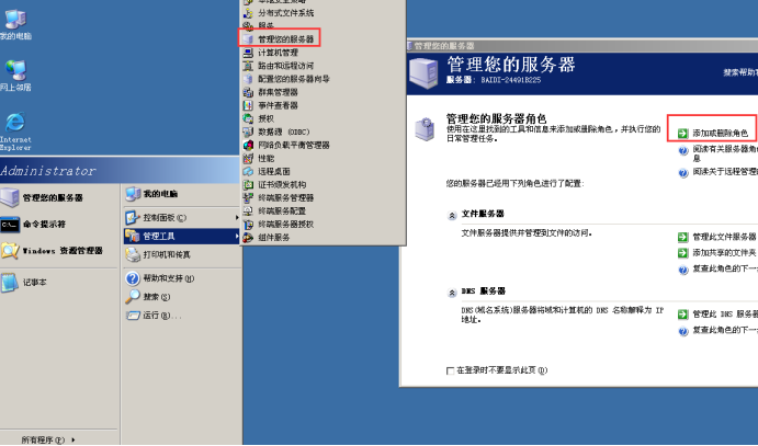 1、点击开始 管理工具 打开管理您的服务器 点击添加或删除角色