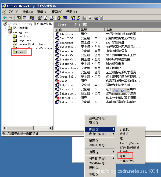 10、重启完毕后打开 域控制器 在users 空白处右击新建用户
