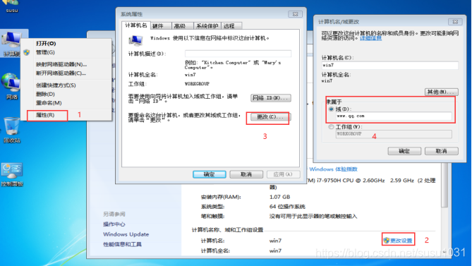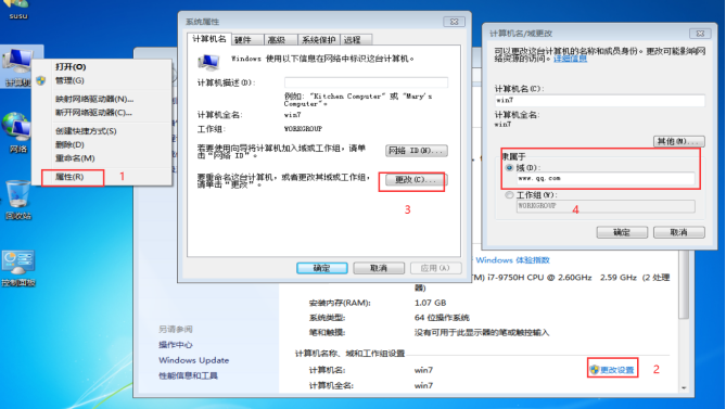- 右键计算机 点击属性 打开点击更改设置 点击计算机名 进行更改