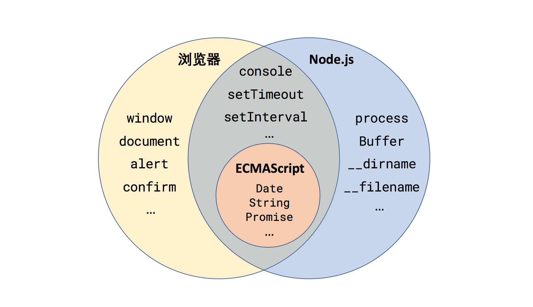 process、Buffer、__dirname、__filename等等; - 浏览器和 Node 共有,但是实现方式不同,例如
