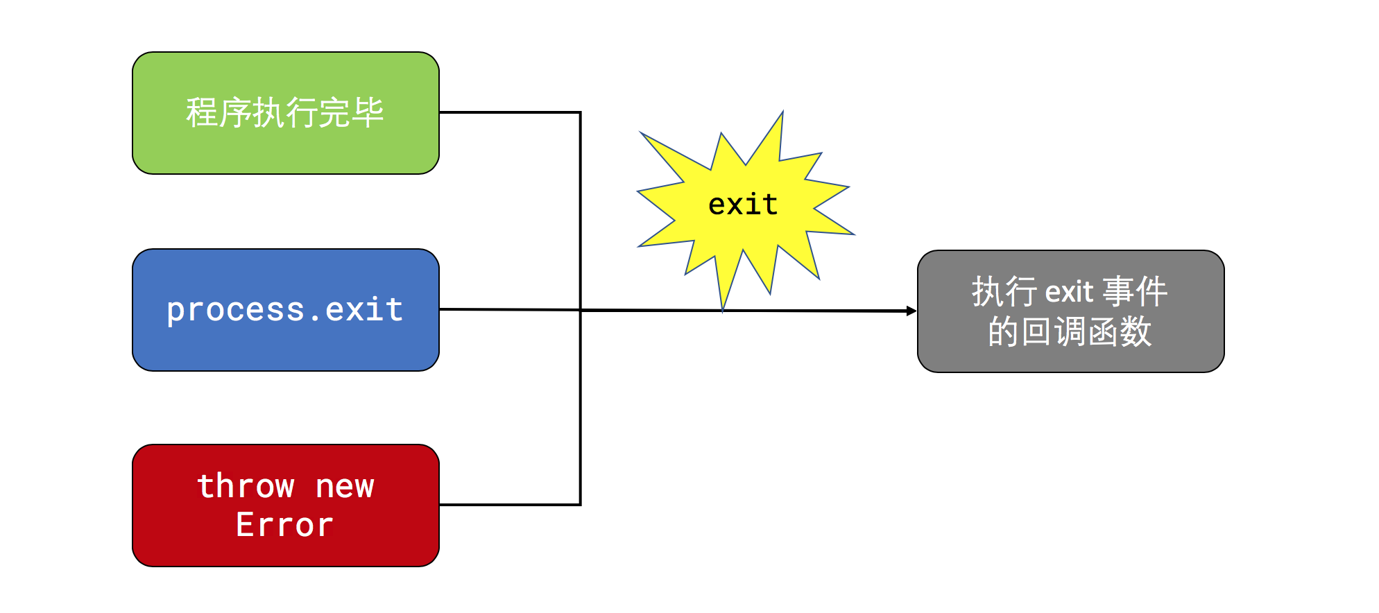 运行后,会在程序退出后打印“下次再见~”的字符串。你可能会问,为啥不能在 setTimeout 的回调函数中添加程序退出的逻辑呢?因为除了正常运行结束(也就是等待了指定的时间),我们的程序很有可能会因为其他原因退出(例如抛出异常,或者用 process.exit 强制退出),这时候通过监听 exit 事件,就可以在确保所有情况下都能执行 exit 事件的回调函数。如果你觉得还是不能理解的话,可以看下面这张示意图: