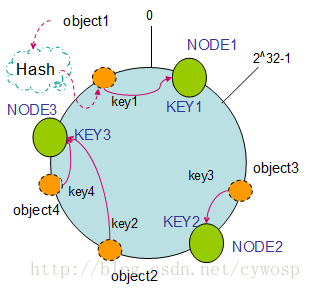 通过上图可以看出对象与机器处于同一哈希空间中,这样按顺时针转动object1存储到了NODE1中,object3存储到了NODE2中,object2、object4存储到了NODE3中。在这样的部署环境中,hash环是不会变更的,因此,通过算出对象的hash值就能快速的定位到对应的机器中,这样就能找到对象真正的存储位置了。