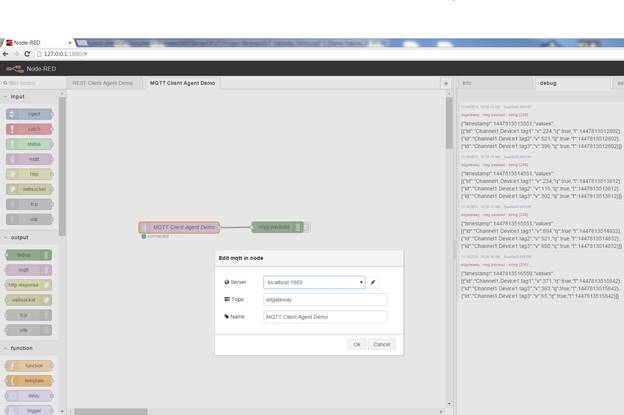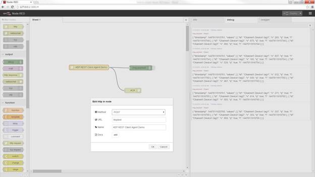 基本/默认.asp?solution=/\u用户界面/selfservice/pkb/PublicKnowledgeSolution/d?&id=50133000000f9YF构建节点红色流,如下图所示,您将看到JSON格式的数据每秒钟出现在调试控制台中。