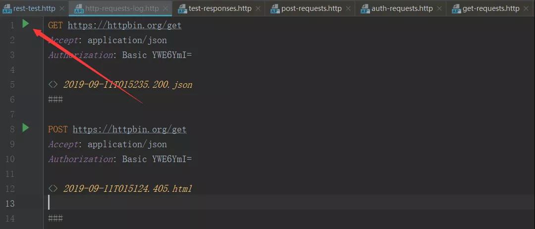 文件内容大如下图所示,再次发出请求只要点击那个运行按钮即可。如果从请求历史记录再次发出请求,则其执行信息和响应输出的链接将添加到请求历史记录文件的顶部。