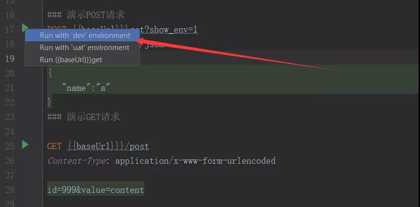 那么在选择执行请求的时候,IDEA就会让你选执行那个环境的配置,如: