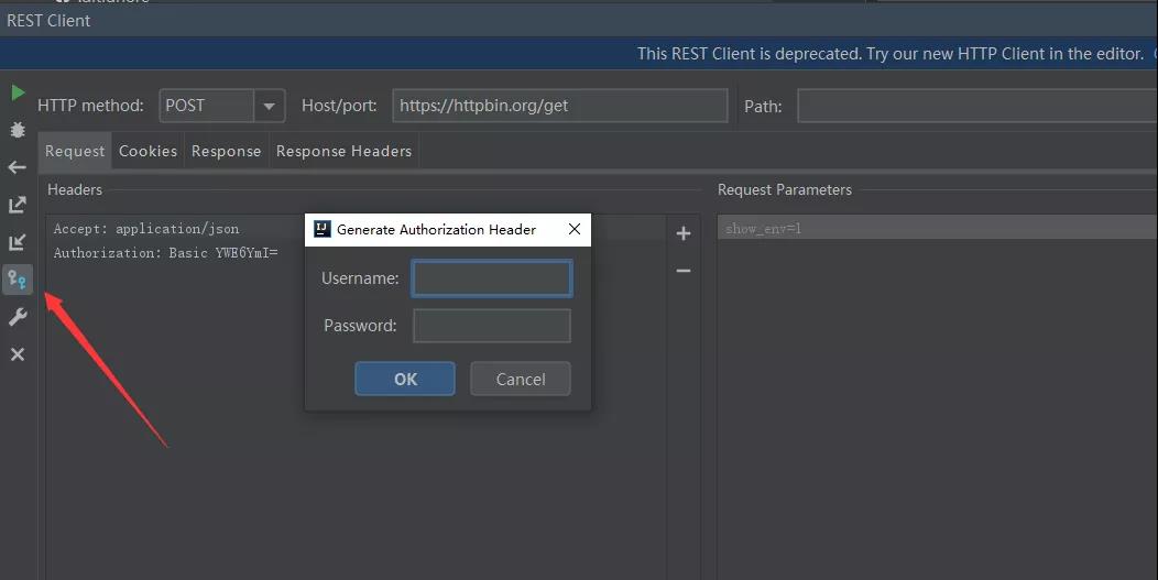 可以看到,这个控制台展示的功能区和postman已经没什么差别了,包括请求方式,请求参数和请求头的填充都已经包含了,特别说明下的是,如果请求的方式是Authorization :Basic这种方式认证的话,可以点击下图所示的按钮,会弹出填充用户名和密码的窗口出来,填完后会自动补充到Authorization 的header里面去