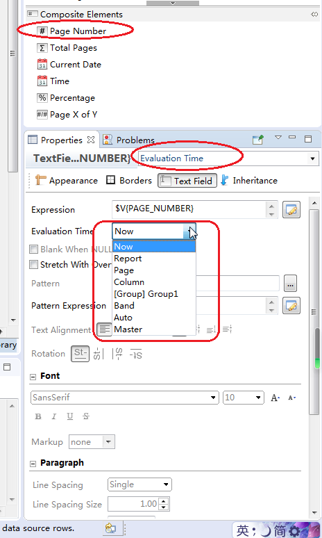 任何新建的Report都默认包含了几个变量,分别为PAGE_NUMBER,COLUMN_NUMBER,REPORT_COUNT,PAGE_COUNT,COLUMN_COUNT 我们要使用的是PAGE_NUMBER PAGE_NUMBER属性Evaluation Time,选择“Now”时,表示当前页数,选择“Report”时,表示总页数,如下图所示。