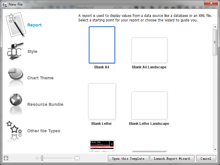 在ireport designer左上角工具栏中点击“文件”,下拉列表中选择“New...",弹出如下对话框: