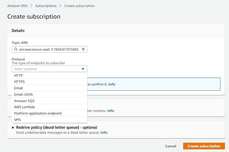 1. SNS页面,创建一个topic,输入topic name,接着创建subscription,选择email。由下图看出,可以选择http、email、SQS、lambda等