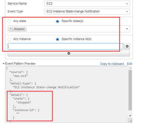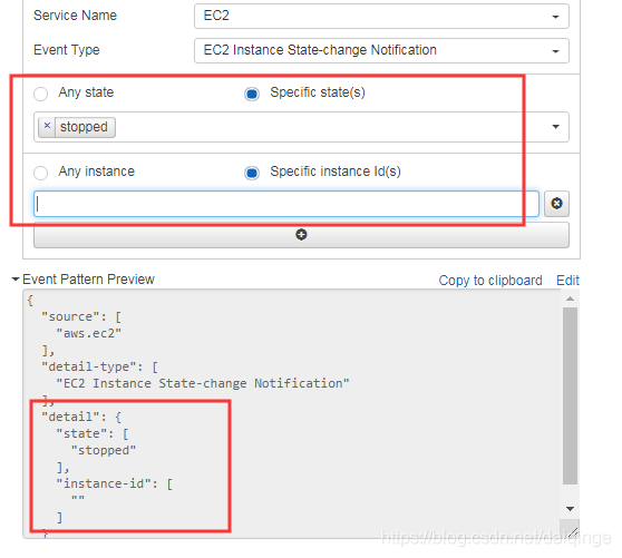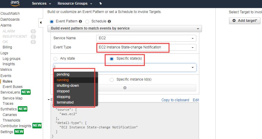 (2)步骤(1)中的service name选择EC2, 接着选择event type,有any state和指定的两种。如果选择specific states,则会列出所有状态。