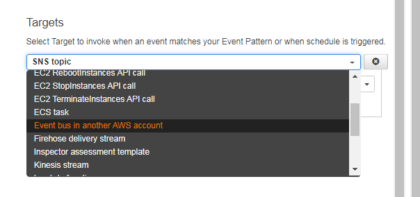 (3)上图右侧的target,选择步骤1中创建的sns topic名字。可以看到target的service选择也很多。