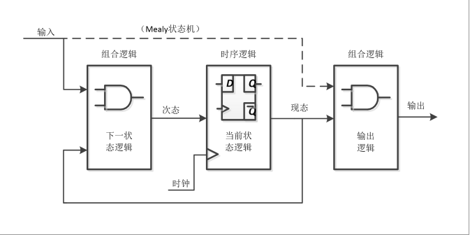 Mealy型状态机:输出不仅和状态有关而且和输入有关。